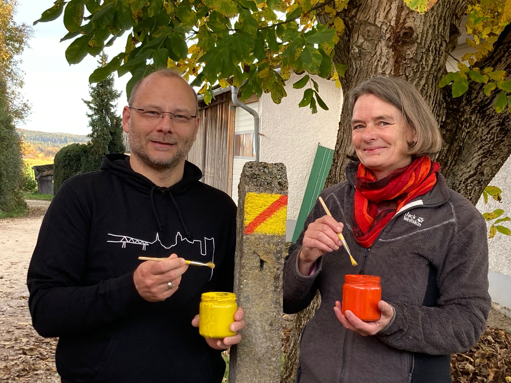 Das Bild zeigt Jürgen Friedmann und Bärbel Janker mit je einem Farbbehälter (gelb und rot) neben einer Wegmarke.